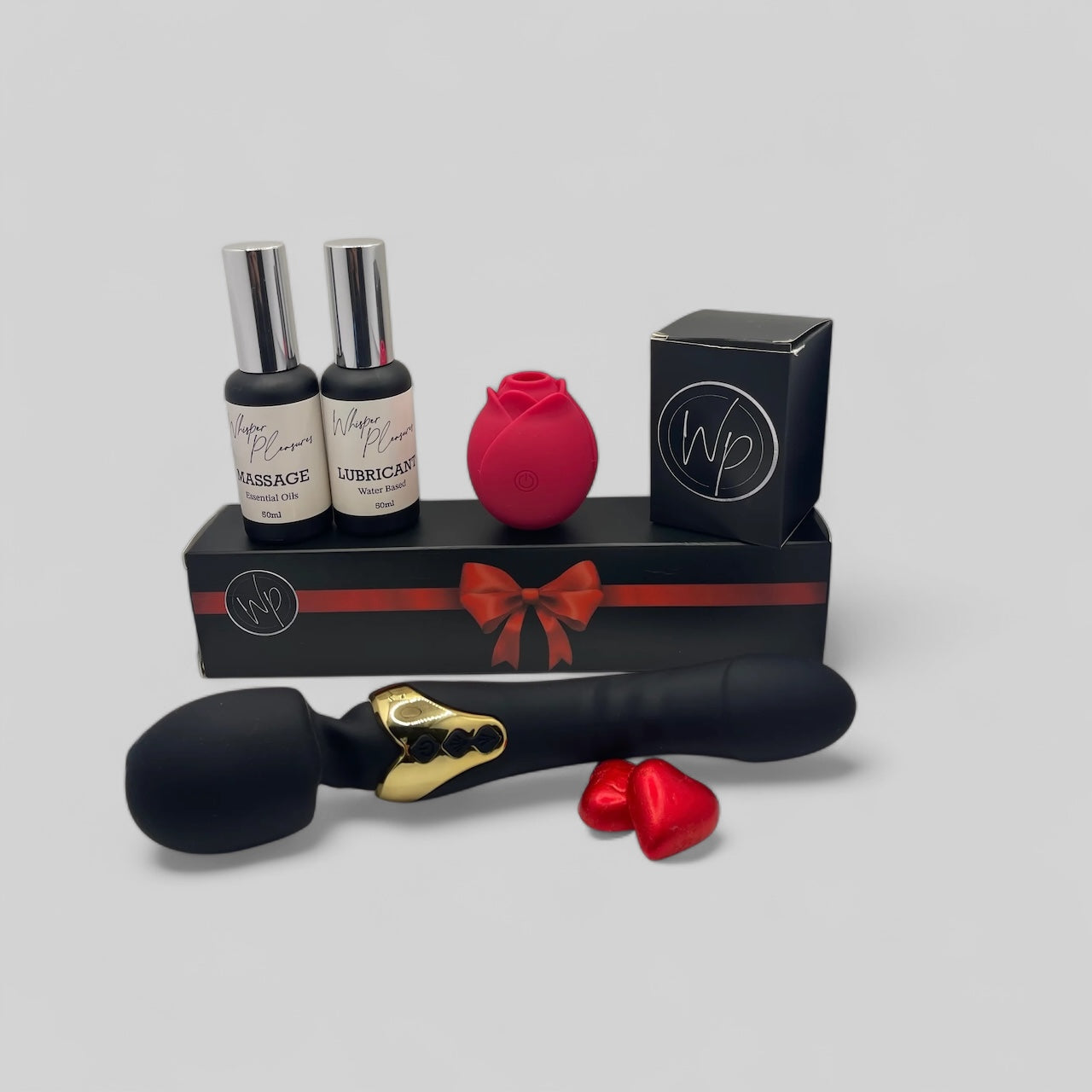 Featuring the Sweet Secret Wand and Rose Clitoral Suction Toy, both crafted from body-safe silicone and packed with powerful settings, this set delivers double the delight. Paired with Whisper Pleasures Massage Oil and Water-Based Lubricant, you'll create moments of deep connection and playful exploration.